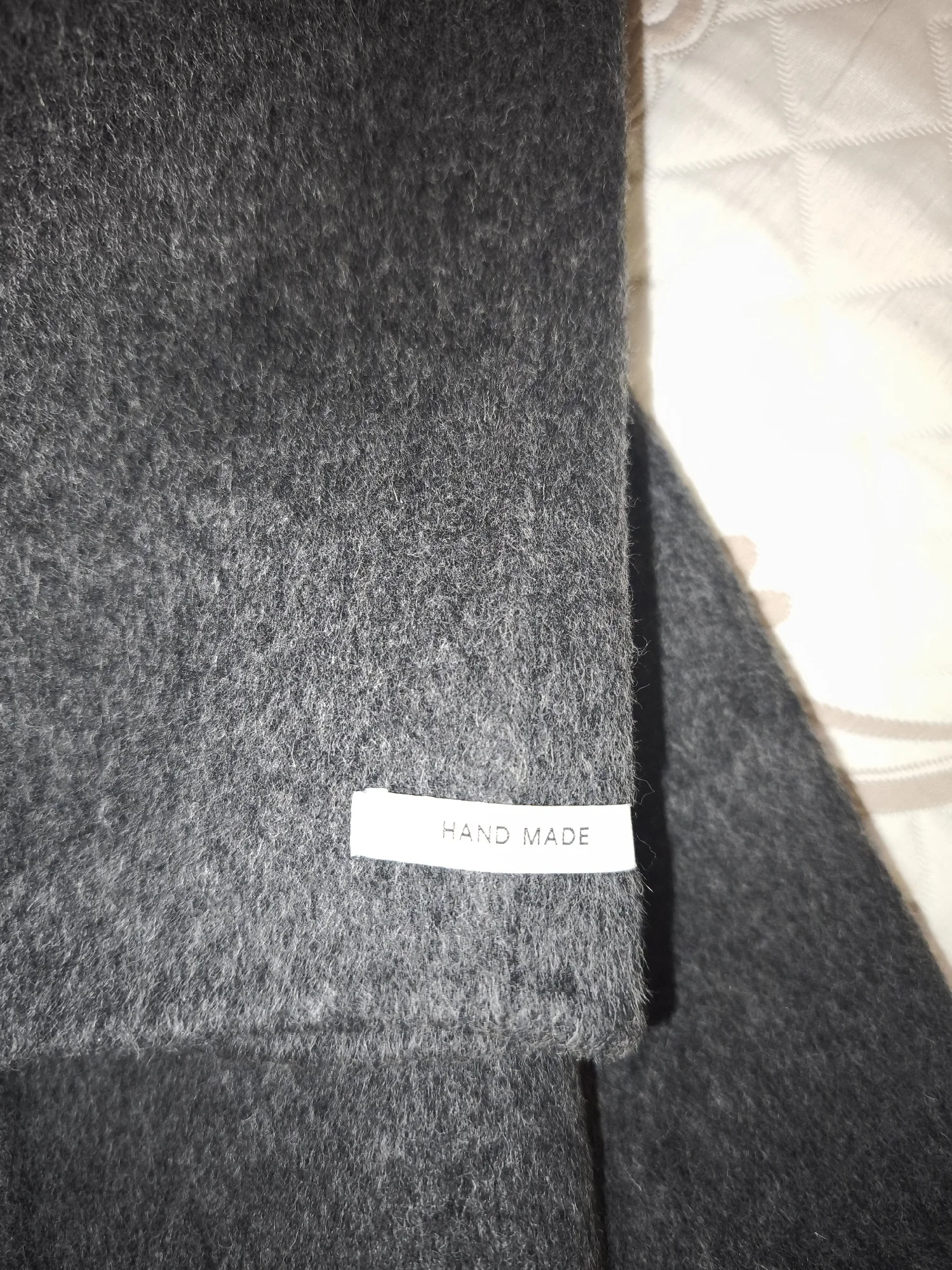 I am delighted with the coat: premium quality, sewn in an amazing way as double fabric and all seams are hidden inside; if turned inside out, only the welt pockets are visible. It is indicated that it is handmade, with a tag saying 100% wool. Delivery on time, price more than adequate. Thank you to the seller!